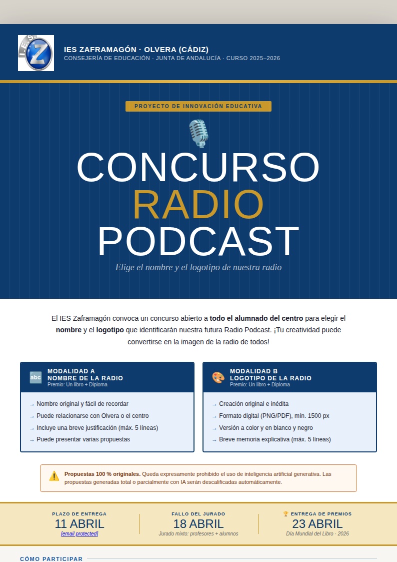 El IES Zaframagón lanza un concurso para crear el nombre y el logotipo de su futura radio podcast, una oportunidad única para que el alumnado deje su huella en un proyecto que sonará en todo el centro.