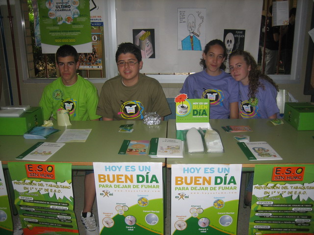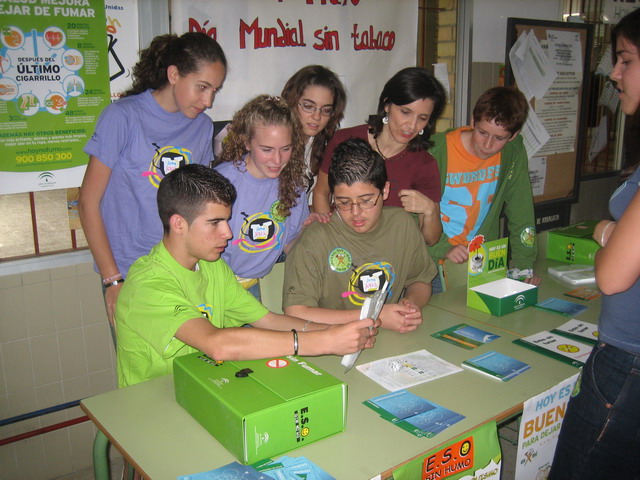 El pasado 31 de Mayo 2007 celebramos el día Mundial sin tabaco en nuestro instituto. Para ello, en colaboración con el centro de salud de Olvera, montamos un stand en la entrada de nuestro centro, con carteles y publicidad diversa sobre los efectos nocivos del tabaco (incluyendo una maqueta simulando la absorción del humo del tabaco en los pulmones), así como los efectos beneficiosos en el organismo desde el mismo momento de su abandono. Participarán en este acto los profesores/as del Departamento de Biología y Geología, de Educación Física y de Orientación. Hemos seleccionado a ocho alumnos/as de 3º de E.S.O. que repartirán material informativo al respecto.