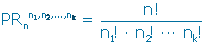 Llamamos PERMUTACIONES CON REPETICIÓN de n elementos en las que el primer elemento se repite n1 veces, el segundo se repite n2 veces ... y el último se repite nk veces a los distintos grupos de n elementos que se pueden hacer de forma que en cada grupo, cada elemento aparezca el número de veces indicado y que dos grupos se diferencian únicamente en el orden de colocación. Se representa por Pnn1,n2,...,nk. |