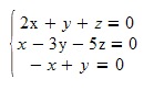 Pues bien, estos sistemas siempre son compatibles, pues al hacer la matriz ampliada añadimos una columna de ceros, por lo que el rango no puede aumentar, así que, en estos sistemas, siempre habrá solución, una ( que será (0,0,0) ) o muchas según sea compatible determinado o indeterminado.