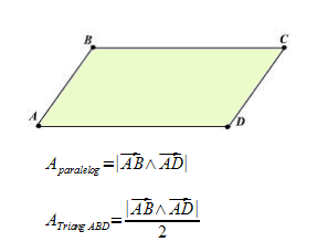 Por tanto, el área de un triángulo puede calcularse dividiendo el módulo del producto vectorial de los vectores que forman dos lados entre 2, pues el triángulo ocupa la mitad del paralelogramo.