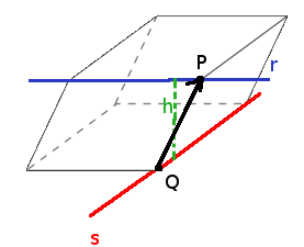 Fíjate que con los vectores se forman un paralelepípedo y el volumen de éste, como vimos en el punto 4, es el producto mixto de los tres vectores. Por otro lado, el volumen de esta figura se puede calcular como área de la base por la altura, y el área de la base será el producto vectorial, o mejor dicho el módulo del producto vectorial de , pues son estos vectores los que limitan los lados de la base, y la altura, h, es precisamente la distancia entre las dos rectas. Así que, despejando obtenemos la fórmula que hay que aplicar: