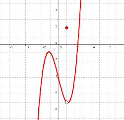Si te fijas en la primera gráfica, si nos acercamos en el eje X a 1, la función, tanto por la izquierda como por la derecha de 1, se acerca a -7. El problema está en que justo cuando llegamos al valor x=1, la función se va al 2 en lugar de -7. Por tanto, lo que ocurre aquí es que límite e imagen de la función no coinciden: