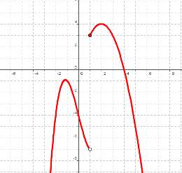Por último, la tercera gráfica no es continua porque en x=1 hay un salto. ¿Qué es lo que ocurre para que haya esa discontinuidad de salto finito? Pues que cuando nos acercamos a 1, la función se acerca a distintas cosas según por el lado que lo hagamos, por la izquierda se acerca a -7 y por la derecha a 3. Luego, lo que ocurre, es que los dos límites laterales existen, son números reales, pero no coinciden.