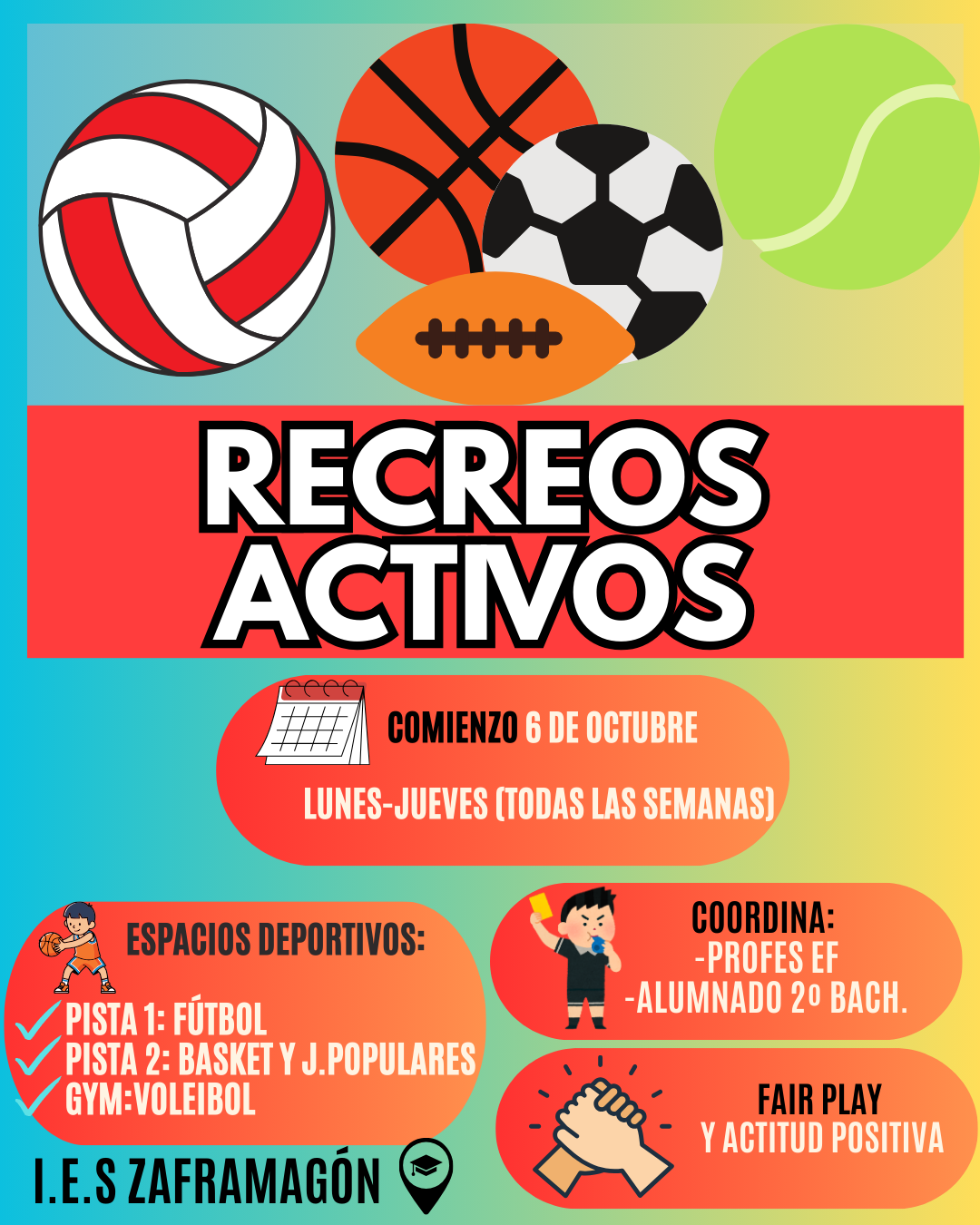 El IES Zaframagón pone en marcha los Recreos Activos para fomentar la actividad física y la convivencia positiva en nuestro centro. A partir del lunes 6 de octubre, durante el recreo, el alumnado podrá participar en distintas actividades deportivas organizadas en varios espacios del centro.